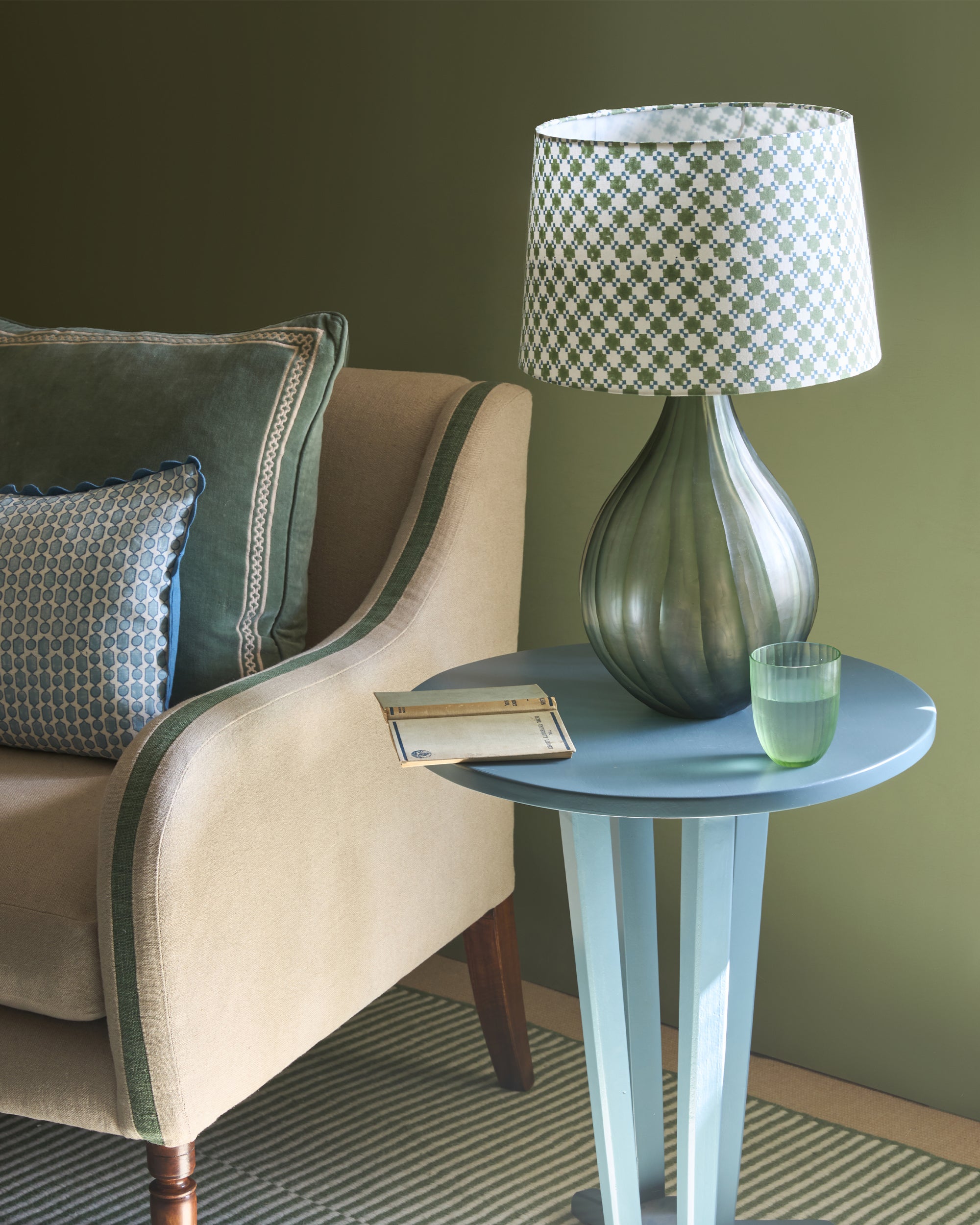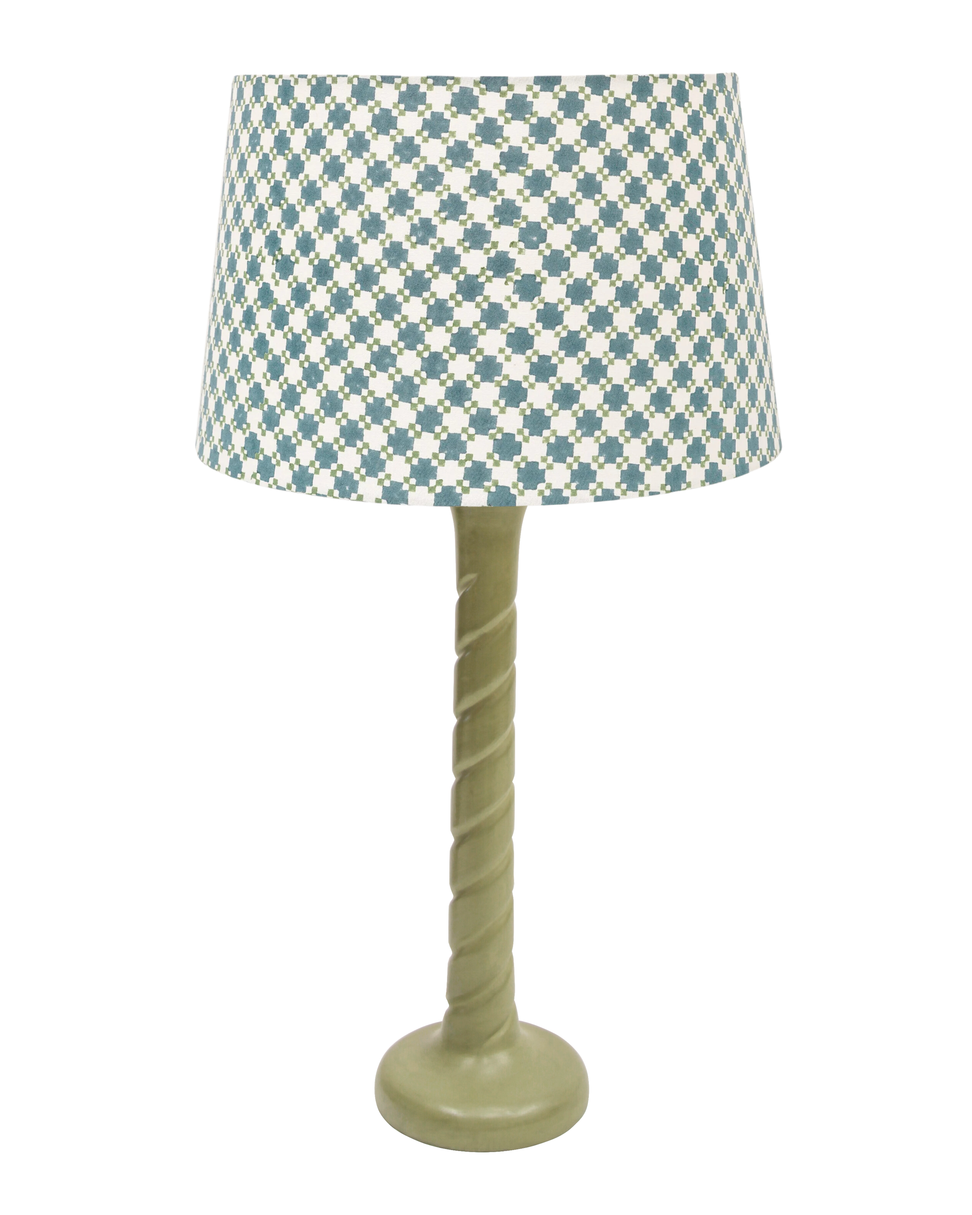 We have chosen our signature Small Twisted Wooden Table Lamp in green to style with the lampshade. This lamp features a slender, hand-carved shape, designed by Birdie and produced by artisans in Saharanpur, India. The result is a harmonious blend of classic and contemporary styles with the lamp’s twisting form beautifully complementing the lampshade’s geometric print.