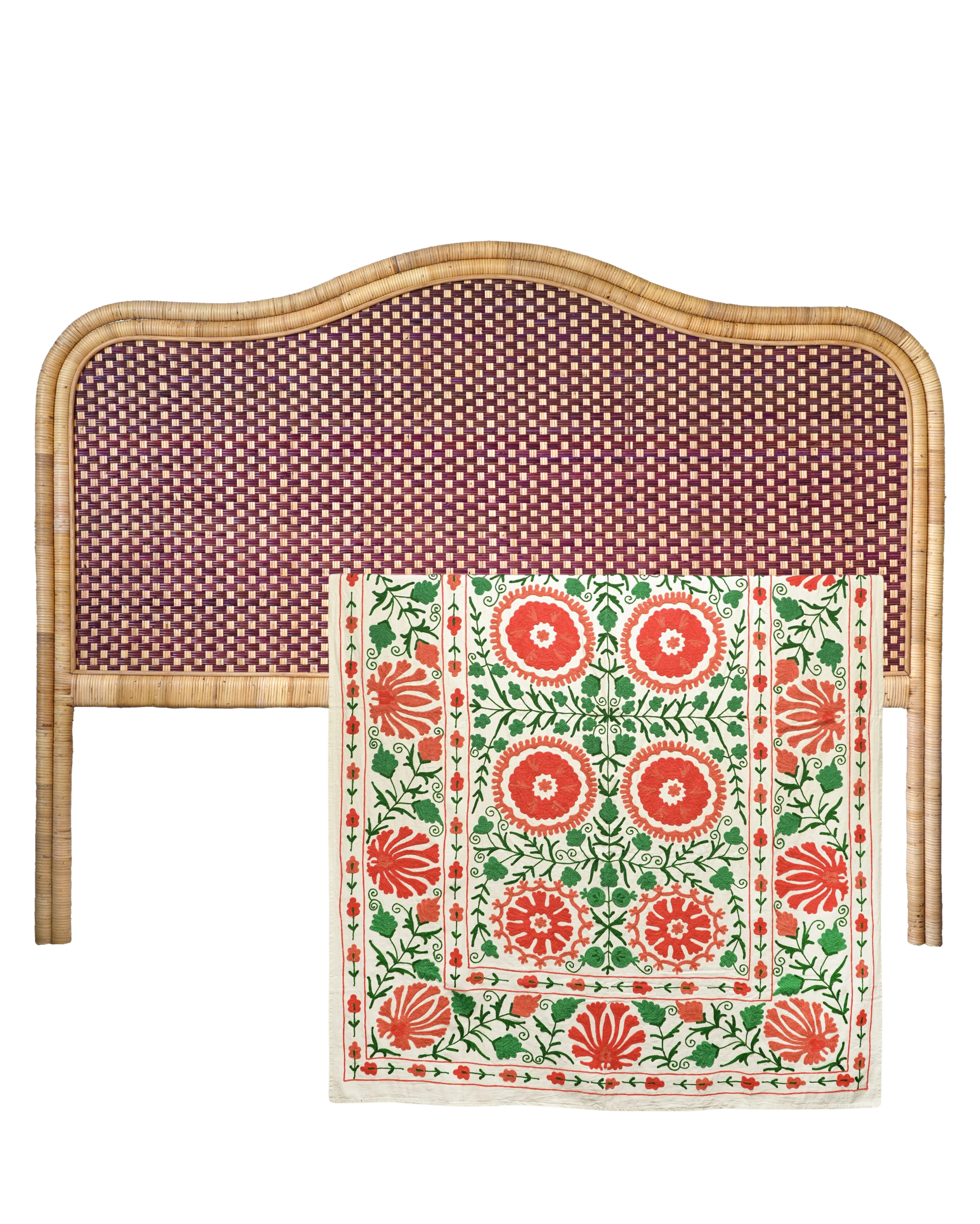 Pairing a Suzani Throw with a pink Rattan Headboard creates a charming and coordinated bedroom - drape the throw over an accent chair or at the foot of the bed, you can even use one as a full bedspread on a single bed. Their intricate botanical designs contrast beautifully with our headboard's whimsical check, while the curved shape and pink colour in both elements anchor the pairing. We love this combination for adding depth and character! For extra comfort add sumptuous cushions and a bright throw for a pop of colour against crisp white sheets. Create a beautiful bed you just can’t wait to roll into!