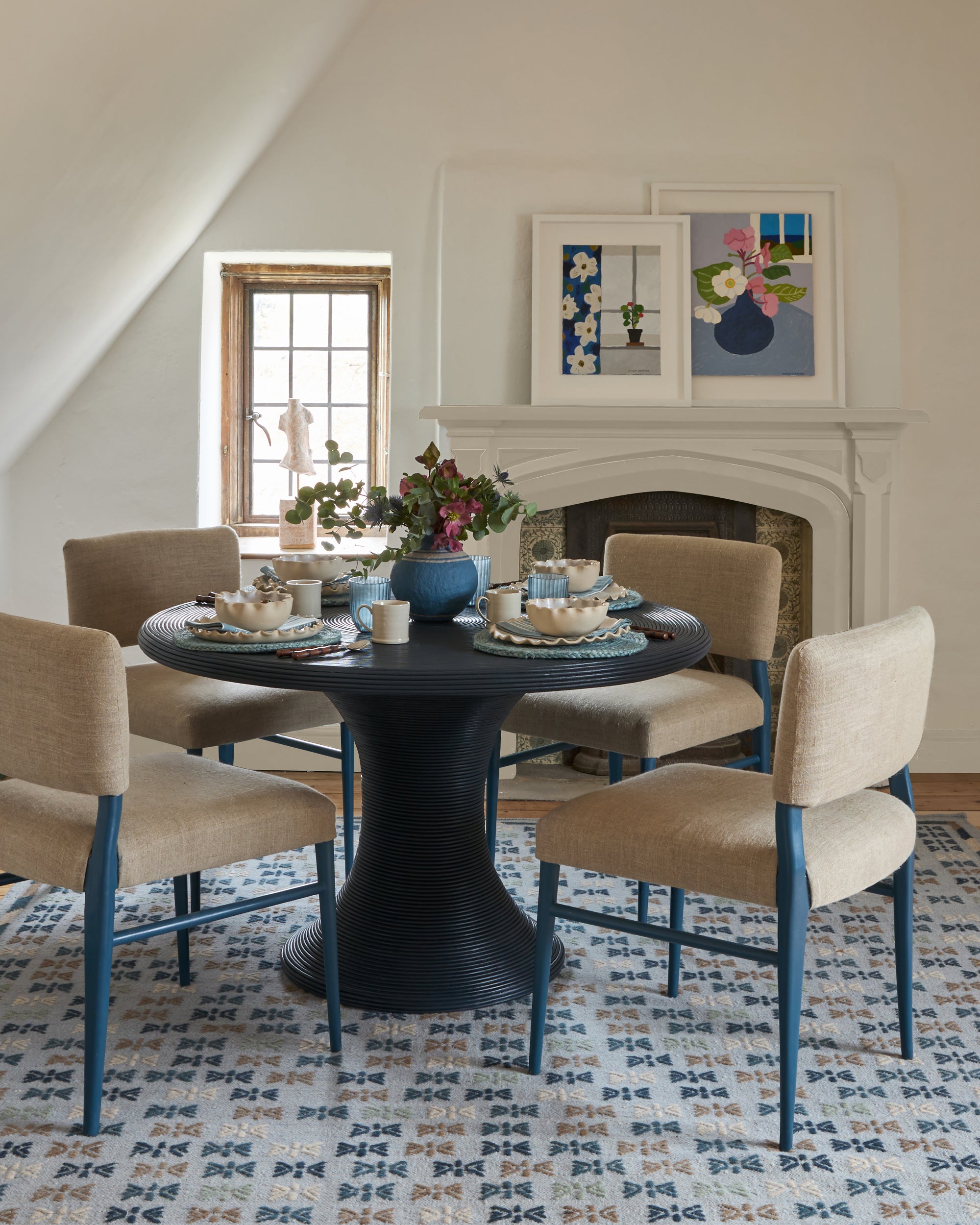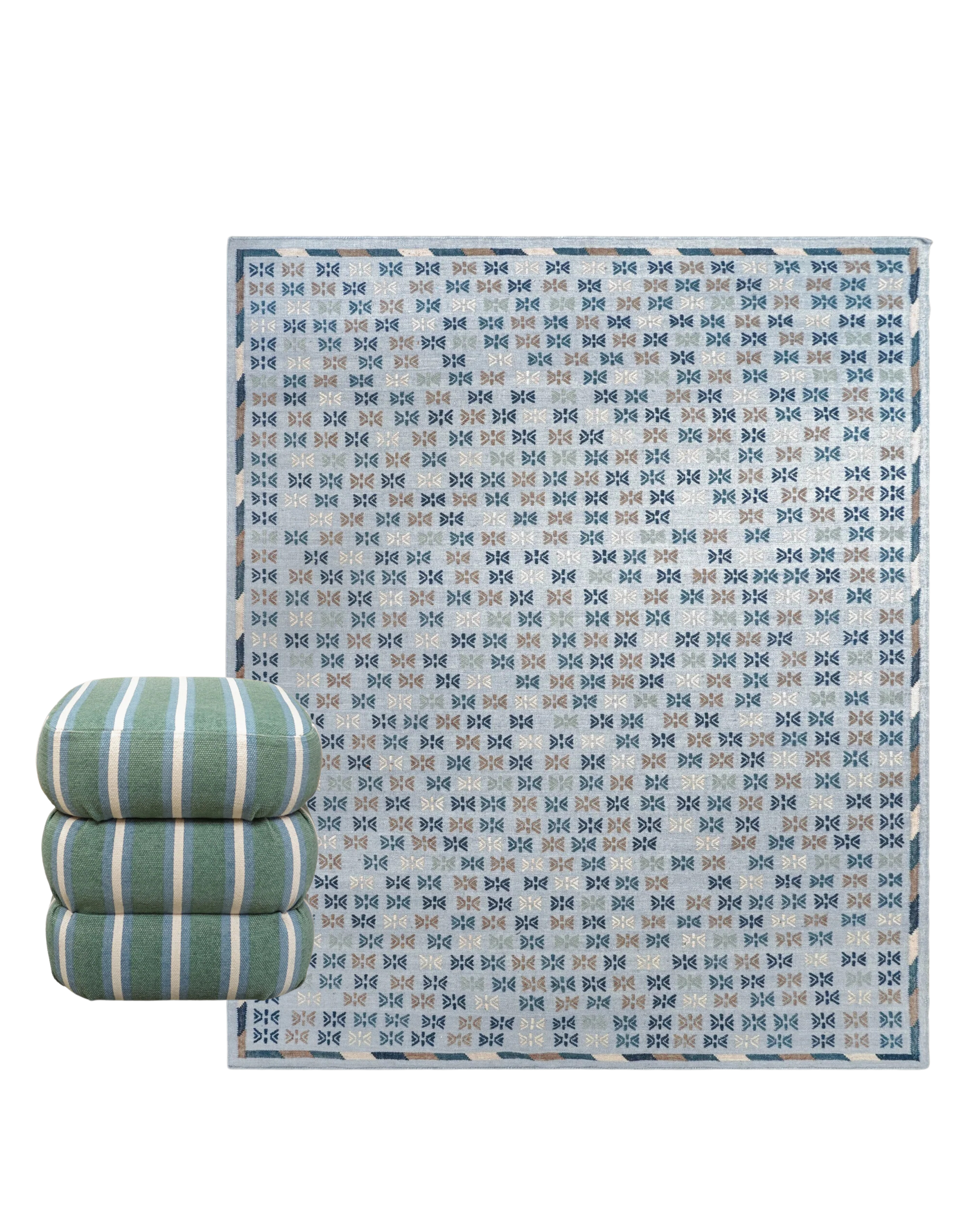 Opting for a blue and green scheme will create a unified and bold aesthetic, they just look so good together! The geometric design of the rug and the stripes of the stool introduce layered textures without overwhelming the space, giving you the opportunity to experiment with more print and pattern combinations to create a look that reflects your personal style. We love this ensemble for a sitting room, with each piece providing visual interest, functionality and comfort for relaxing or entertaining.
