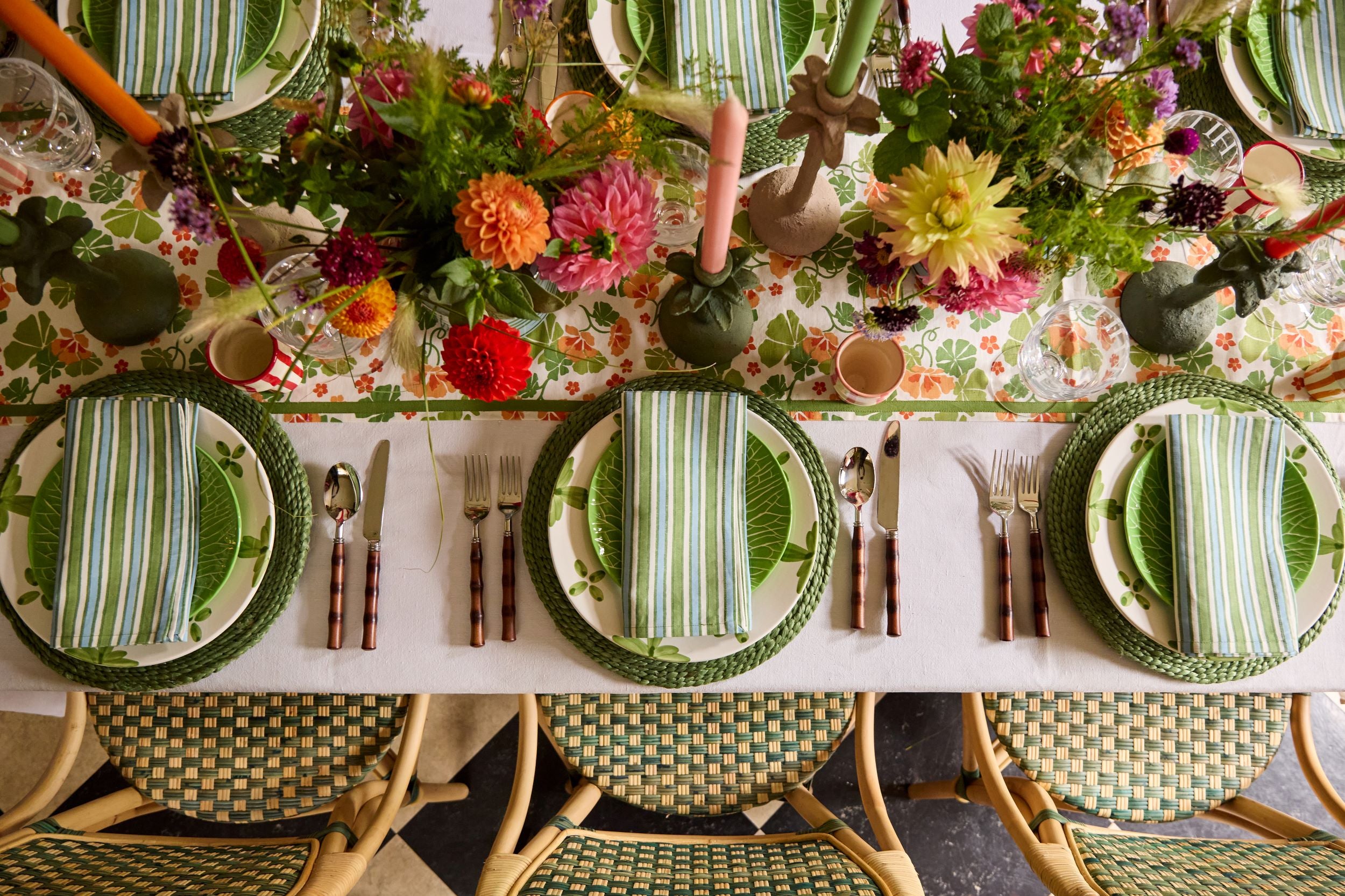 Create a refined yet playful centrepiece with our Palm Leaf Candlestick – a handcrafted accessory that brings together Butter Wakefield’s bold tablescaping and Birdie’s timeless style. Made from papier-mâché on a sturdy metal base, it’s available in soft green or taupe and two sizes for easy layering. Style in clustered heights or line them along your table for instant impact. Pair with our colourfulRattan Placemats and The Nasturtium Runner for a striking, seasonal tablescape full of texture and charm.