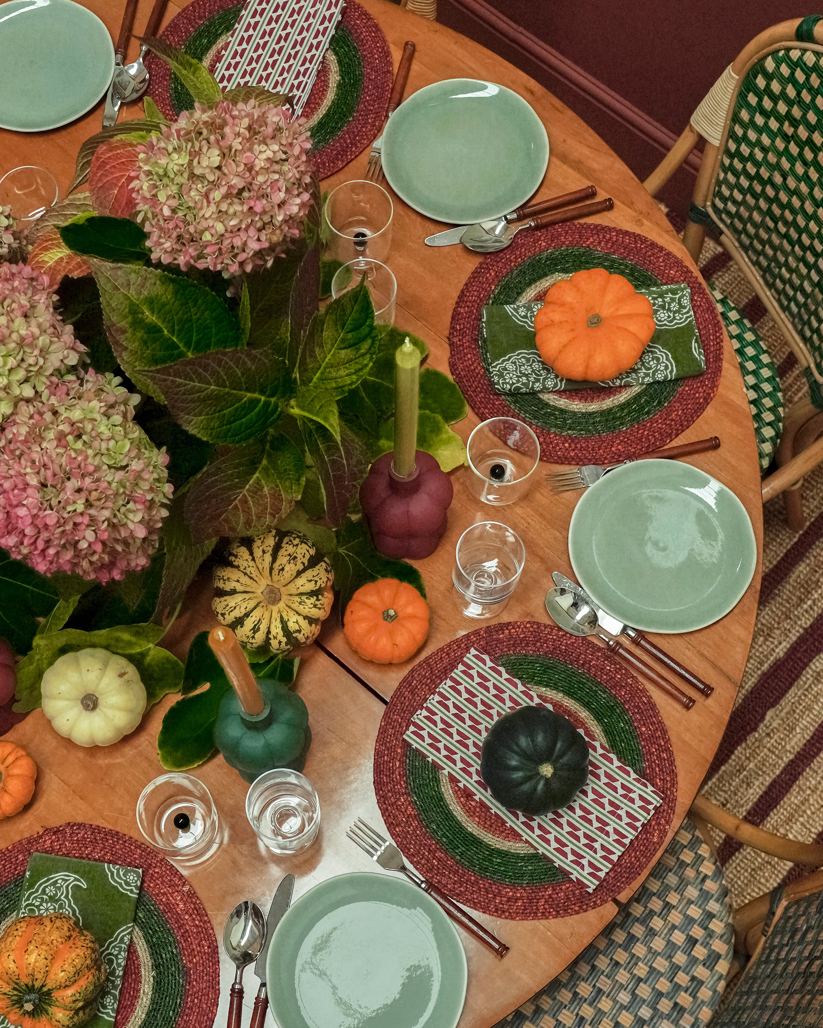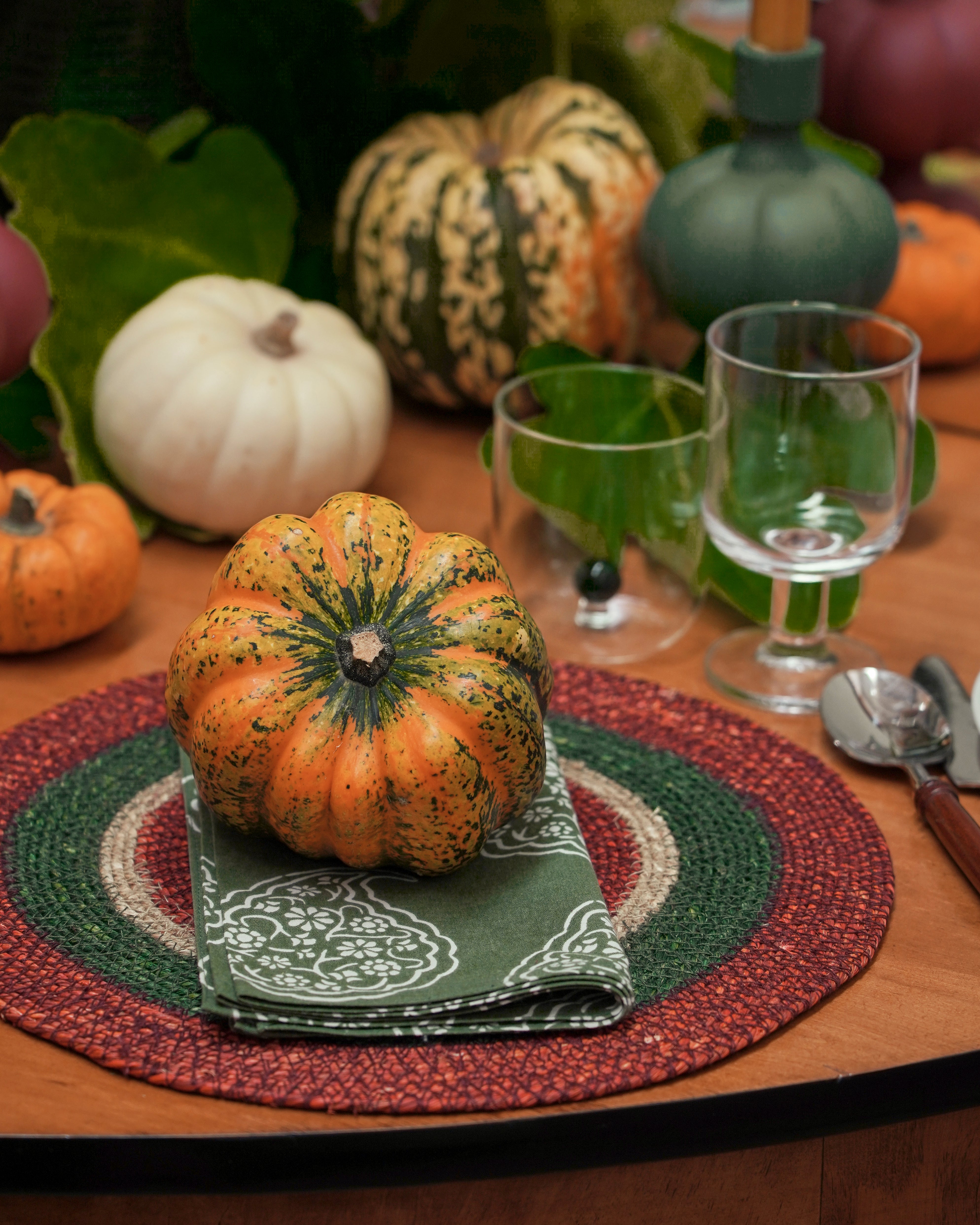 It’s a signature part of our design process that we create palettes and patterns that will effortlessly mix and match. We do this because we believe that the best-dressed tables (or sofas or beds) are those that are lovingly layered. An easy way to embrace this for autumn would be by using a mix of colours from our Paisley Napkin collection, take the green and red for example, and combine them with our blue Paisley Tablecloth. For a bolder look you might layer the Colaba Woven Stripe Napkins or Ladder Stripe Napkins with the red Paisley Tablecloth. The joy of layering is that you can create a different tablescape for every occasion.